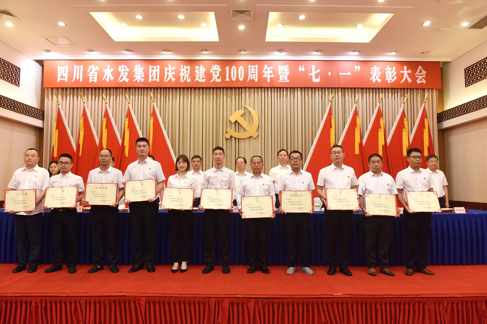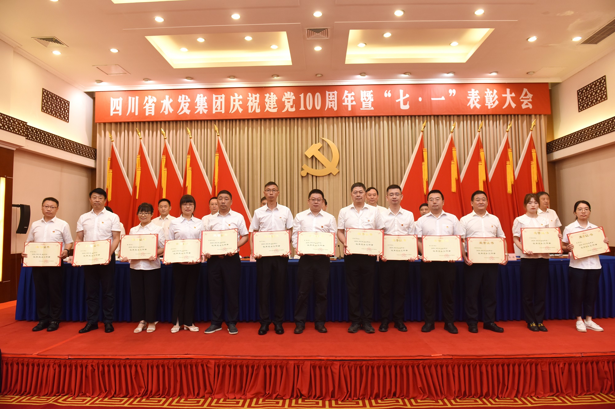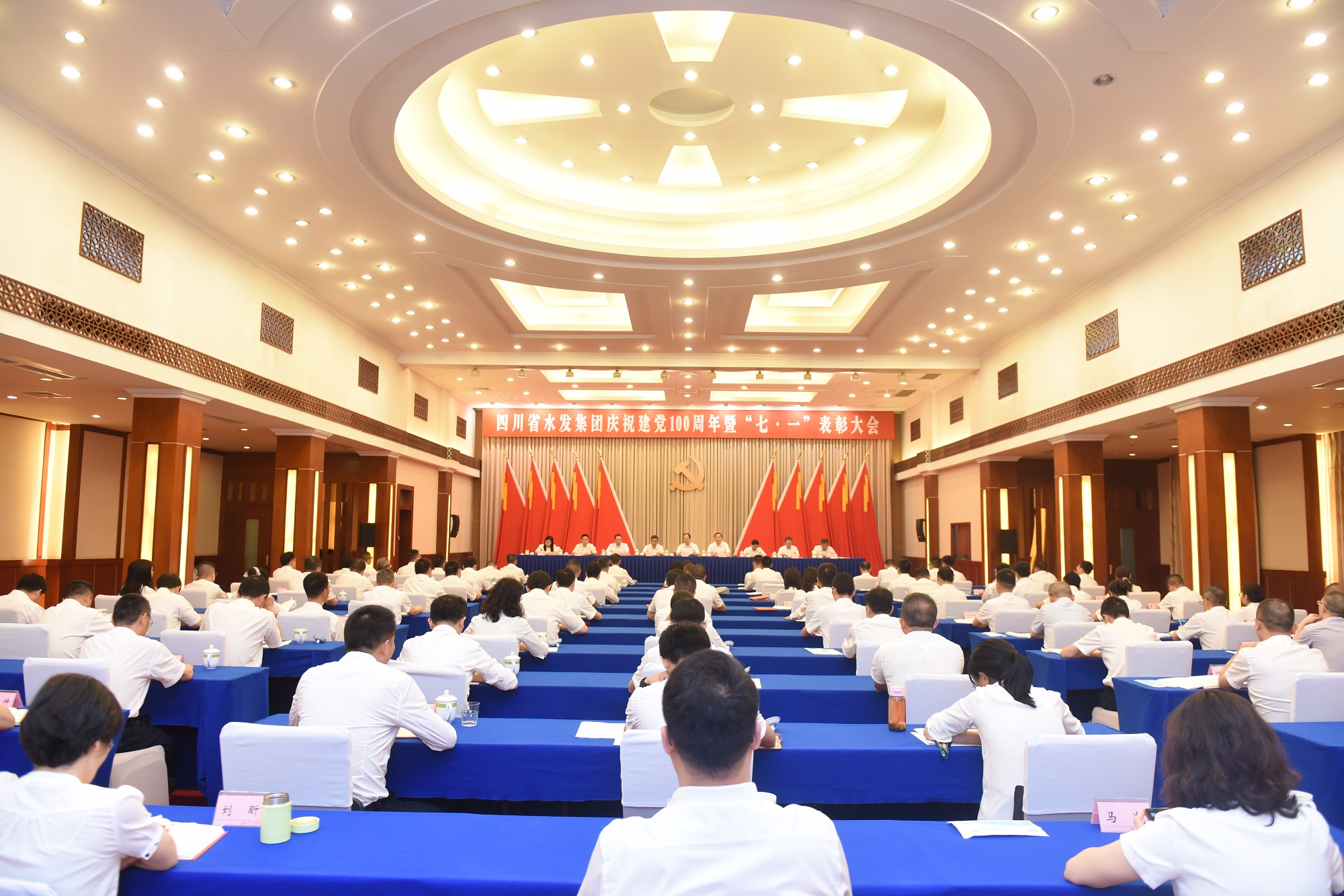 為隆重慶祝中國共產(chǎn)黨成立100周年,回顧黨的光輝歷程,激勵(lì)各級(jí)黨組織和廣大黨員牢記初心使命,服務(wù)集團(tuán)高質(zhì)量發(fā)展,6月25日上午,四川省水利發(fā)展集團(tuán)有限公司在成都召開慶祝建黨100周年暨“七·一”表彰大會(huì)。集團(tuán)黨委書記、董事長鐘杰同志及集團(tuán)領(lǐng)導(dǎo)班子成員出席會(huì)議。集團(tuán)下屬企業(yè)黨委班子成員,受集團(tuán)表彰的優(yōu)秀共產(chǎn)黨員、優(yōu)秀黨務(wù)工作者、先進(jìn)黨組織代表,集體總部全體黨員參加會(huì)議。集團(tuán)黨委委員、紀(jì)委書記吳軍同志主持會(huì)議。