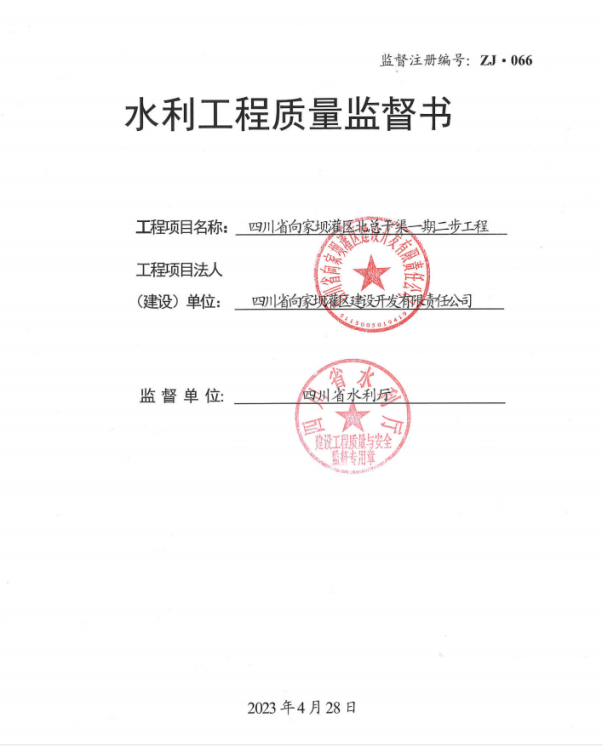 4月28日,《四川省向家壩灌區(qū)一期二步工程質(zhì)量監(jiān)督書(shū)》(監(jiān)督注冊(cè)編號(hào):ZJ-066)正式下發(fā)至公司,標(biāo)志著向家壩灌區(qū)北總干渠一期二步工程質(zhì)量監(jiān)督手續(xù)順利取得。