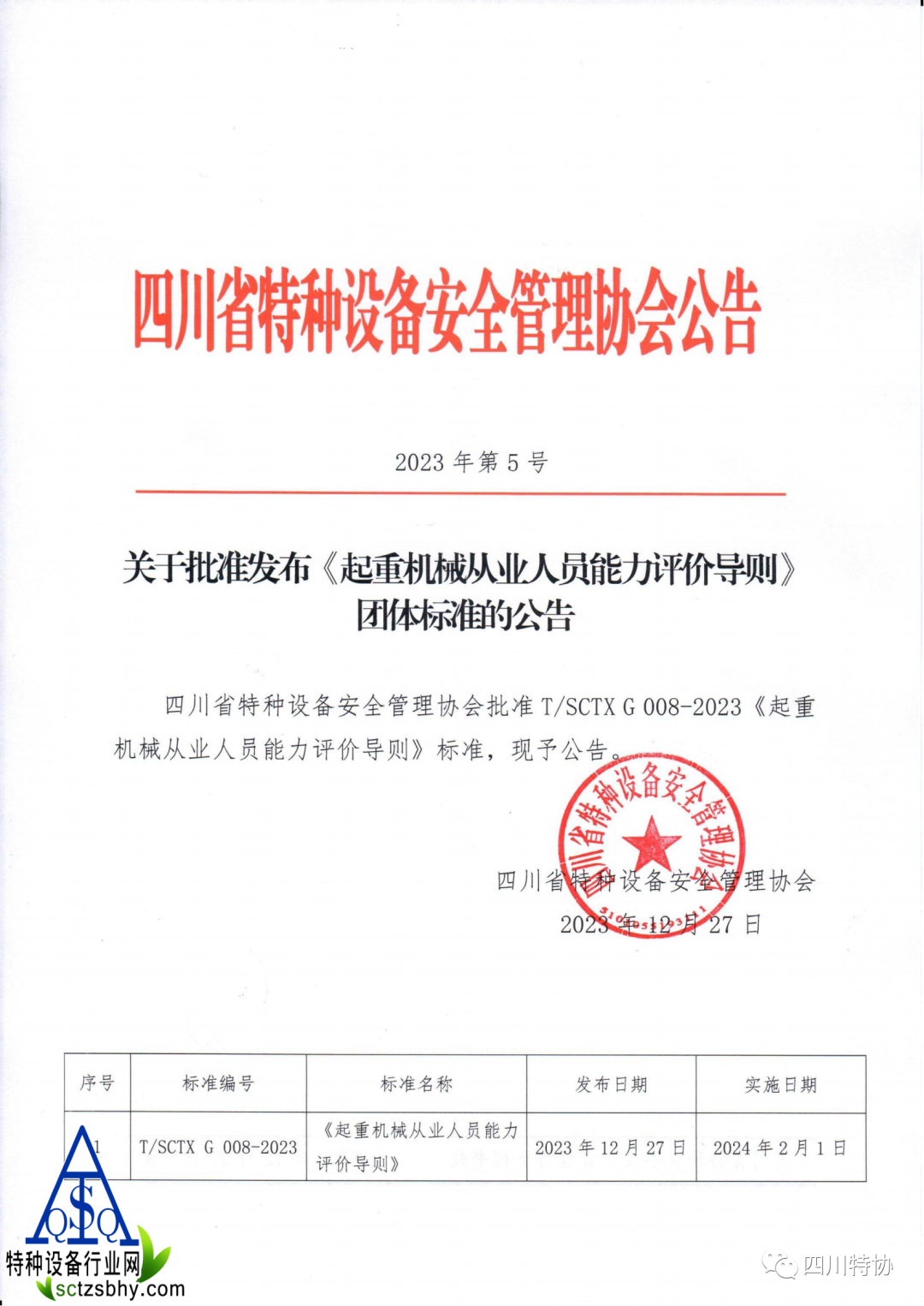 據(jù)四川省特種設備安全管理協(xié)會消息,《起重機械從業(yè)人員能力評價導則》(標準編號T/SCTX G 008-2023)于2023年12月27日發(fā)布,將于2024年2月1日起施行。
