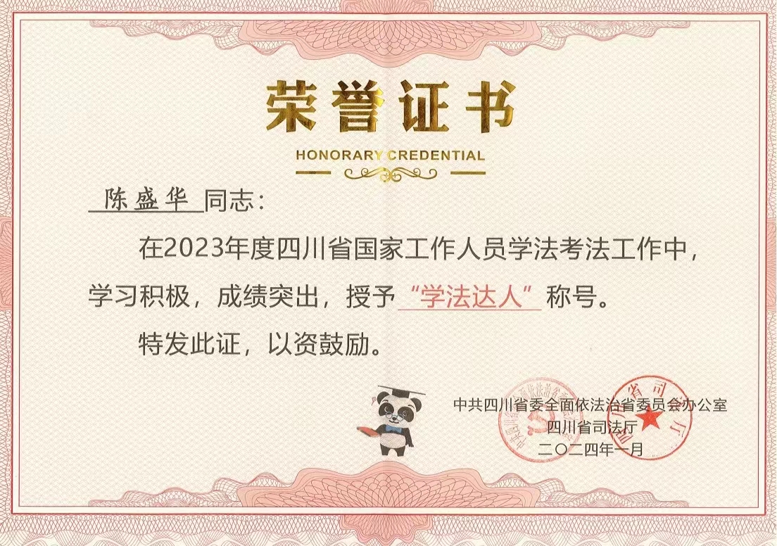 近日,中共四川省委全面依法治省委員會(huì)辦公室、四川省司法廳通報(bào)2023年度四川省國家工作人員學(xué)法考法工作情況,全省114.8萬人參考,評(píng)出學(xué)法超過1000分且年度考法成績(jī)滿分的“學(xué)法達(dá)人”共1143名,其中建設(shè)公司陳盛華同志以位列全省企業(yè)類第3名的成績(jī)喜獲殊榮。