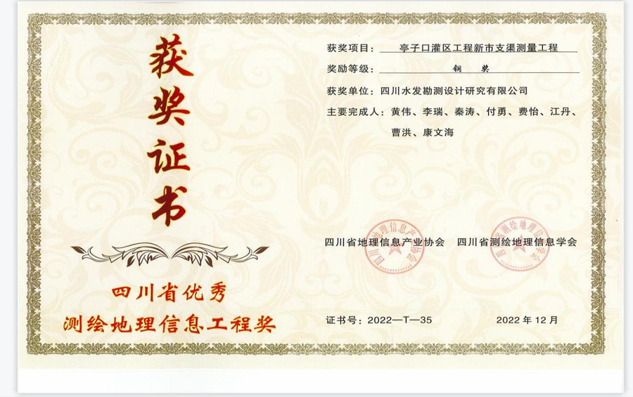 經(jīng)四川省測(cè)繪地理信息學(xué)會(huì)和四川省地理信息產(chǎn)業(yè)協(xié)會(huì)聯(lián)合評(píng)選認(rèn)定,水發(fā)集團(tuán)設(shè)計(jì)公司測(cè)繪分院完成的“引大濟(jì)岷工程地質(zhì)高陡邊坡分析測(cè)繪”和“亭子口灌區(qū)工程新市支渠測(cè)量工程”兩個(gè)項(xiàng)目分別榮獲“2022年四川省優(yōu)秀測(cè)繪地理信息工程獎(jiǎng)”金獎(jiǎng)和銅獎(jiǎng)。