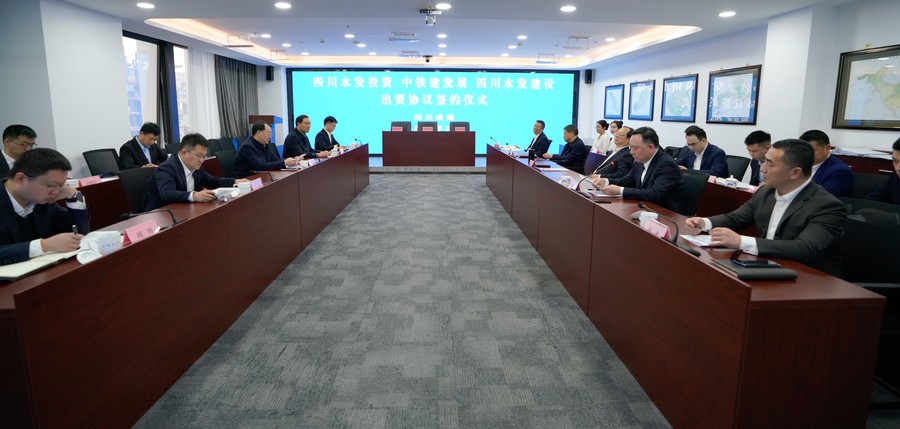 四川水發(fā)投資有限公司黨委副書記、總經(jīng)理郎波,四川水發(fā)建設(shè)有限公司副總經(jīng)理李銀剛,中鐵建發(fā)展集團公司副總經(jīng)理劉小剛共同簽署出資協(xié)議。