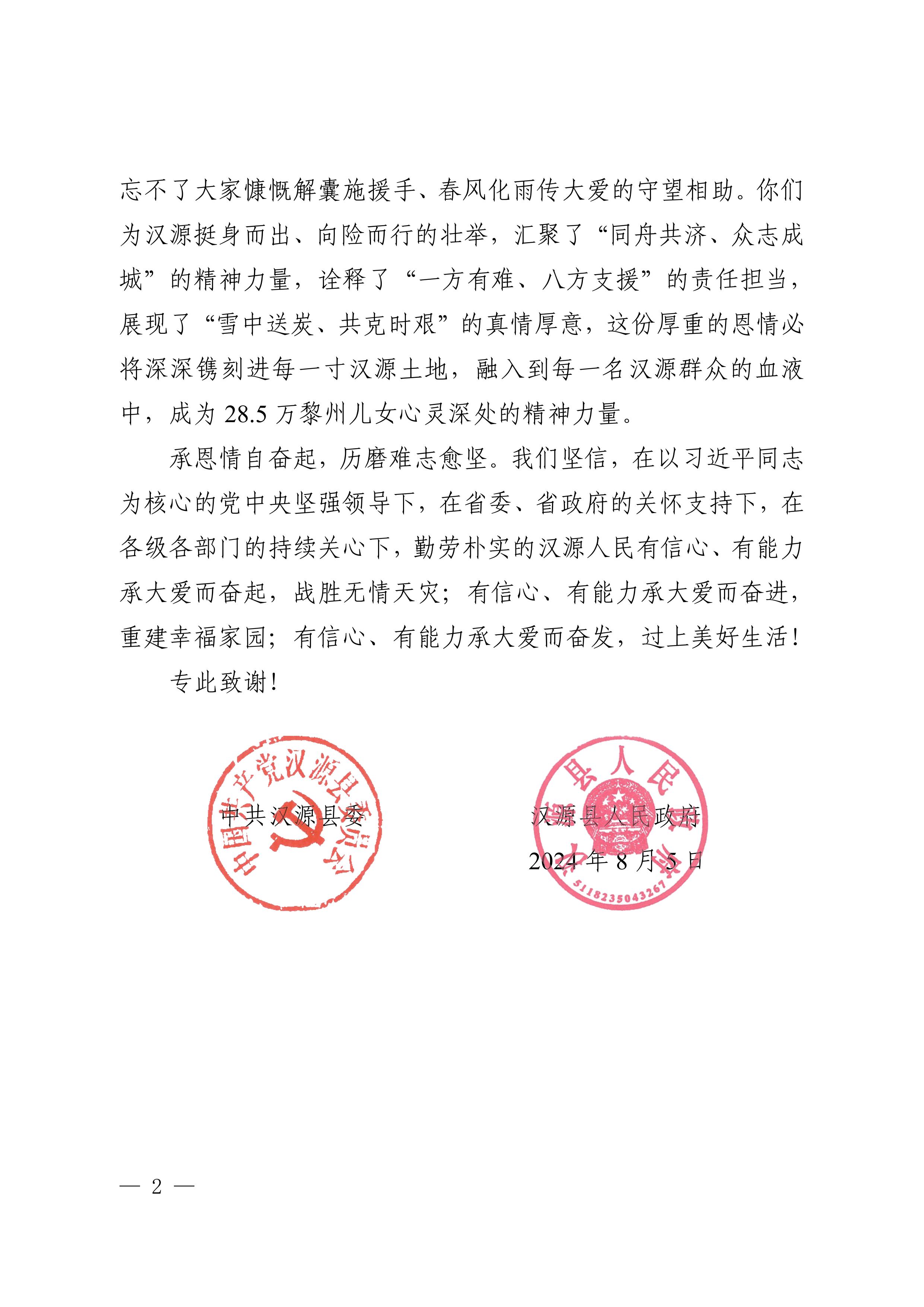 日前,集團(tuán)收到來(lái)自中共漢源縣委、漢源縣人民政府的感謝信,信中對(duì)集團(tuán)在“7?20”漢源縣馬烈鄉(xiāng)突發(fā)山洪泥石流災(zāi)害應(yīng)急搶險(xiǎn)救災(zāi)中迅速響應(yīng)、行動(dòng)有力表示了衷心的感謝,對(duì)搶險(xiǎn)人員的日夜堅(jiān)守和全力以赴表達(dá)了崇高的敬意。