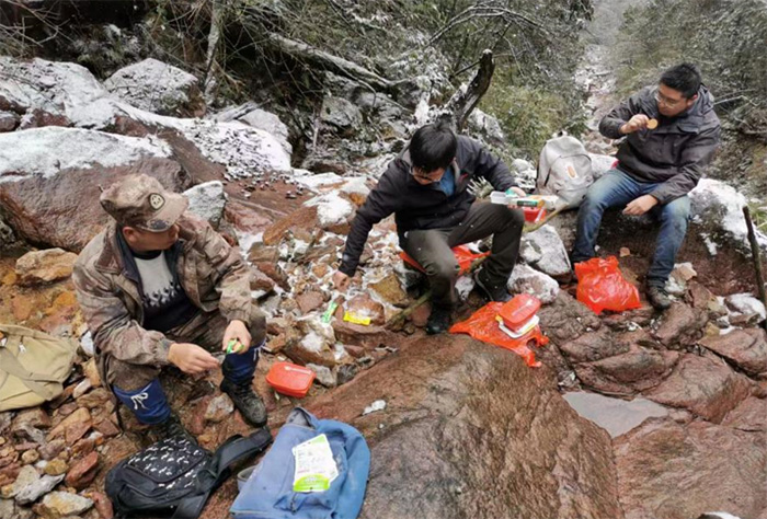 2021年12月的一天,勘察分院麥高飛同志與其他同志早上7點天未亮就起床去腳基坪電站廠房接向?qū)В謭鲎o林員),8點30分在溝口架設(shè)好RTK基站后,他們和兩名向?qū)Ь脱刂嗍鳒希S沙溝)順溝而上,沿途雨雪交加,雪越下越大,到處都是陡坎跌水與溪流,在向?qū)ьI(lǐng)下,他們四肢并用攀爬在亂石遍布的溝谷,經(jīng)過不懈的努力,終于在中午兩點左右測放完粽隧ZK2號深孔。饑寒交迫的他們在附近的小溪邊冒雪草草吃了幾口自熱方便飯后,就立即返程。于晚上6點30分左右安全到達(dá)腳基坪電站附近的318國道邊,共用時10個小時。在上山的路上,汗水濕透了內(nèi)衣,雨雪打濕了外套,放孔后的他們被寒風(fēng)吹得瑟瑟發(fā)抖,艱難到達(dá)318國道邊后,累得癱坐在公路邊的值班車上,只想坐下來好好休息。這僅僅是麥高飛同志進行地質(zhì)勘察工作的一個縮影!這也是麥高飛同志的工作日常!